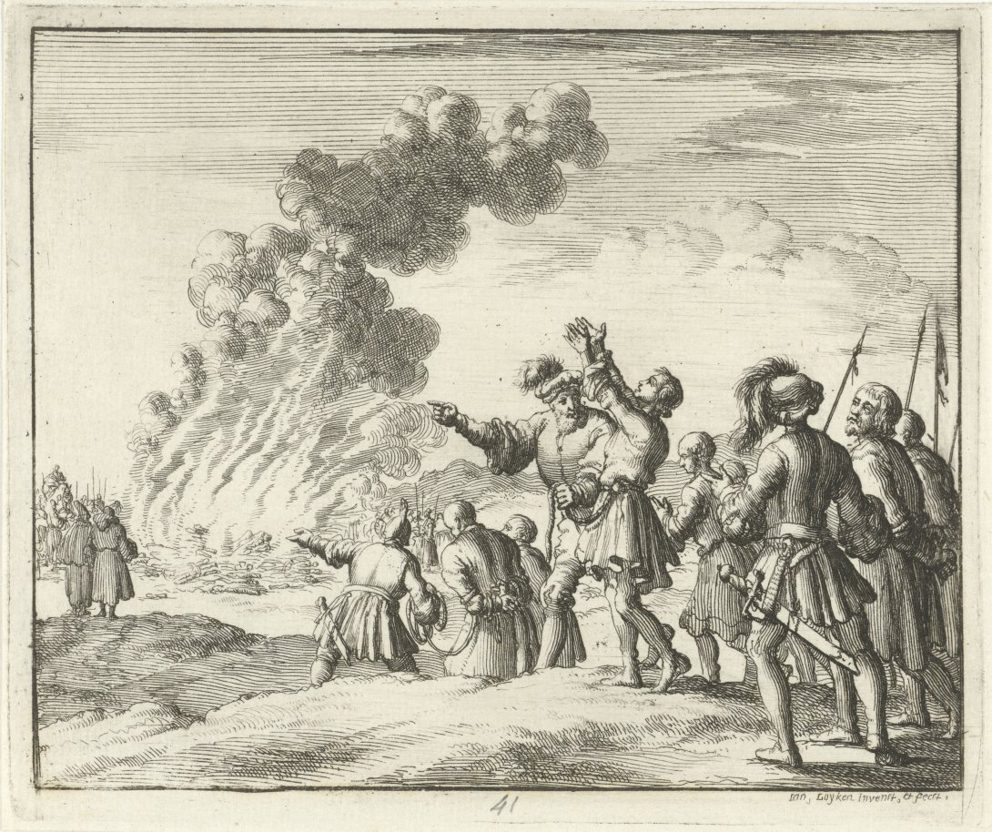 Lorsque le roi et tous ceux qui étaient présents virent qu’ils ne pouvaient pas être détournés de leur croyance, il commanda qu’un très grand feu de bois soit allumé non loin de la ville, afin que peut-être, terrifiés par cela, ils puissent renoncer à leur croyance. Mais, au moment où ils allaient être conduits au feu, ils crièrent à haute voix, disant qu’ils le désiraient ardemment, et ils se livrèrent entre les mains de ceux qui devaient les attirer au feu. Ils furent livrés aux flammes, au nombre de treize, et tous ceux qui, par la suite, ont été reconnus être leurs adhérents furent mis à mort par le même moyen.