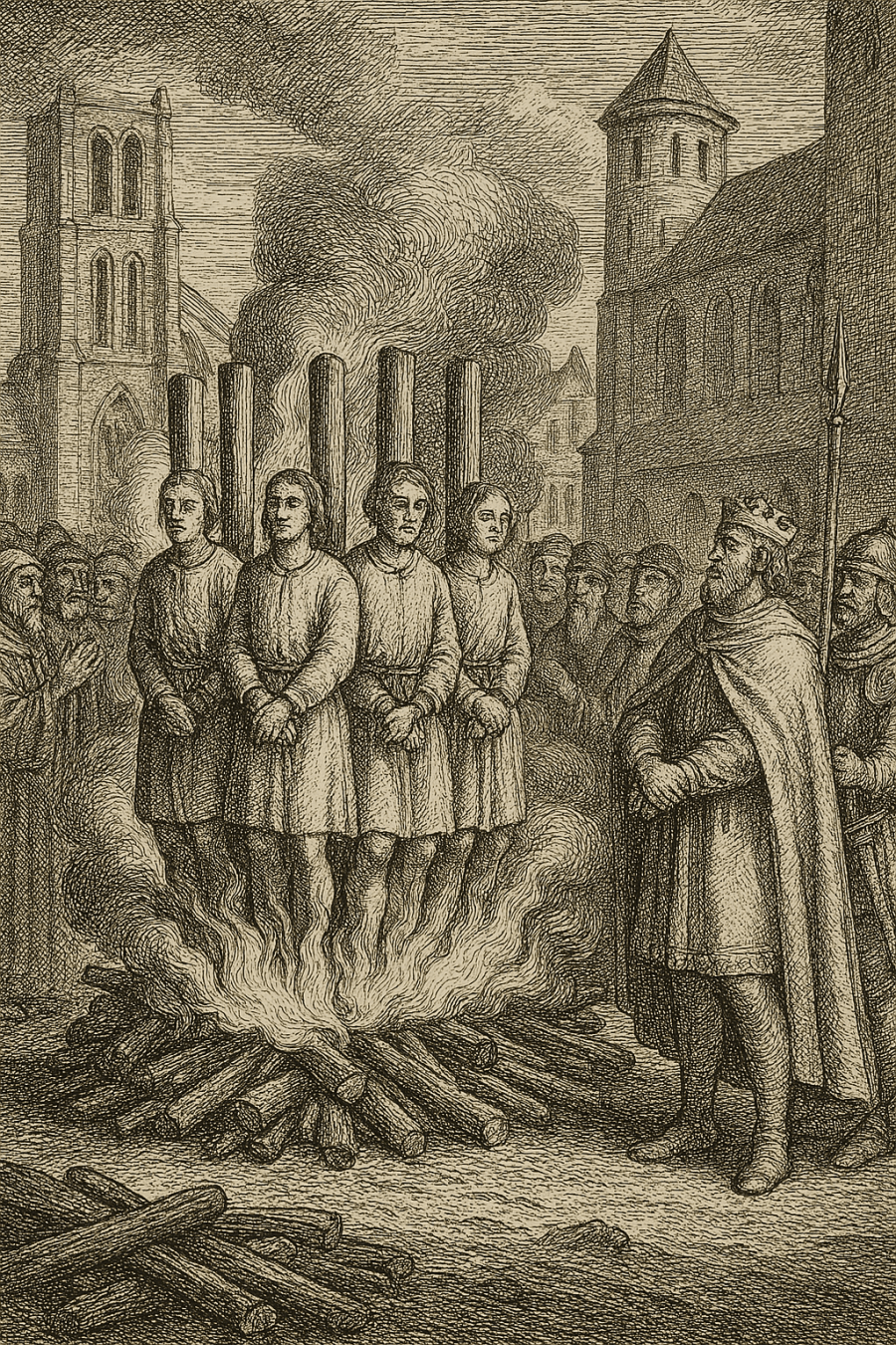 QUATORZE PERSONNES, DONT LE PLUS ÉMINENT S’APPELAIT ÉTIENNE, BRÛLÉES COMME HÉRÉTIQUES À CAUSE DU TÉMOIGNAGE DE LA VÉRITÉ, PAR LES PAPISTES, À ORLÉANS EN FRANCE, VERS LA FIN DE L’AN 1022 apr. J.-C.